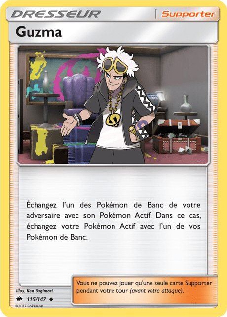 Pour conserver la maitrise du pokémon actif de l’adversaire, nous avons « Guzma » et « Ordre du Boss ».