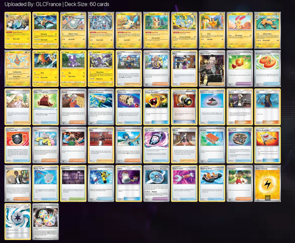 Sans système de pioche avec les Pokémon il faut prévoir de pouvoir piocher des cartes et refaire sa main régulièrement. Les supporters sont surtout là en ce sens, avec Tili, Gamin, Mashynn ou Kabu. L’avantage tu type électrique c’est que beaucoup d’objets permettent d’avancer.
