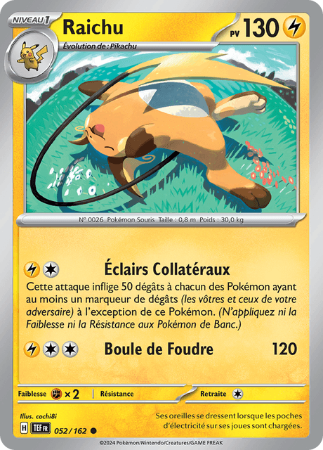 Une fois que des dégâts ont été placés sur tous les pokémons adverses et qu’ils sont tous à +/- 50 PV d’être mis KO … On fait venir Raichu. Le coup de maître serai de faire appel à « Salvio » pour faire évoluer Pikachu rapidement et conserver la surprise de Raichu jusqu’au bout.